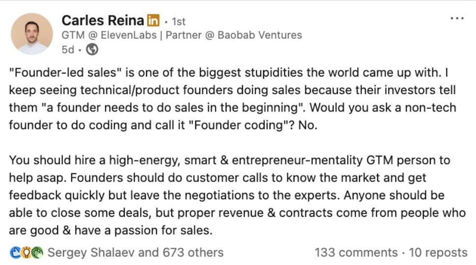 Carles: The context matters. I’m specifically referring to technical founders and I think in two stages. Before you have a real product - your job as founder is to recruit design partners. Those early users or customers are helping shape the product, and that relationship is fundamentally different from a repeatable sales motion. But founders often confuse early design partners with a repeatable sales engine.