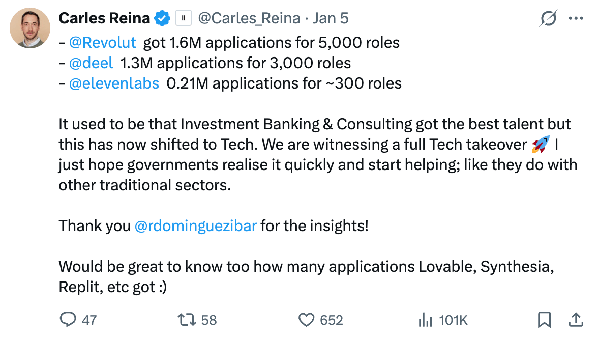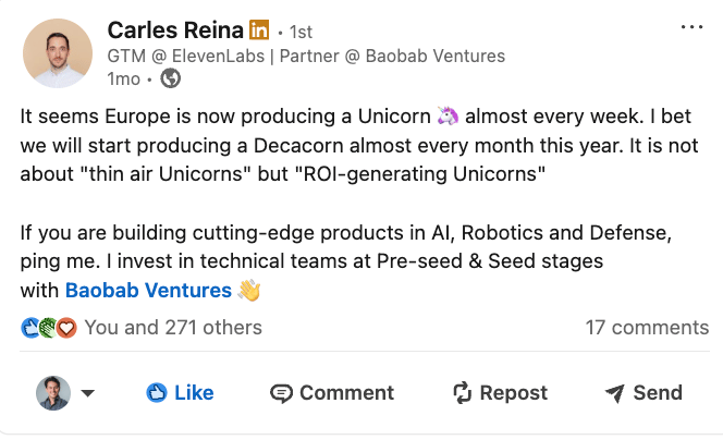Carles: I’m passionate about Europe because we’re finally seeing the startup ecosystem become self-sustaining. Ten years ago, building a start-up in Europe wasn’t “sexy.” Now, you have a growing group of ambitious people who don’t want a traditional corporate path. The dynamic is continuing to bifurcate. One group optimizes for the stability of a 9-to-5 life, and another is drawn to the intensity and ambition of startup building.