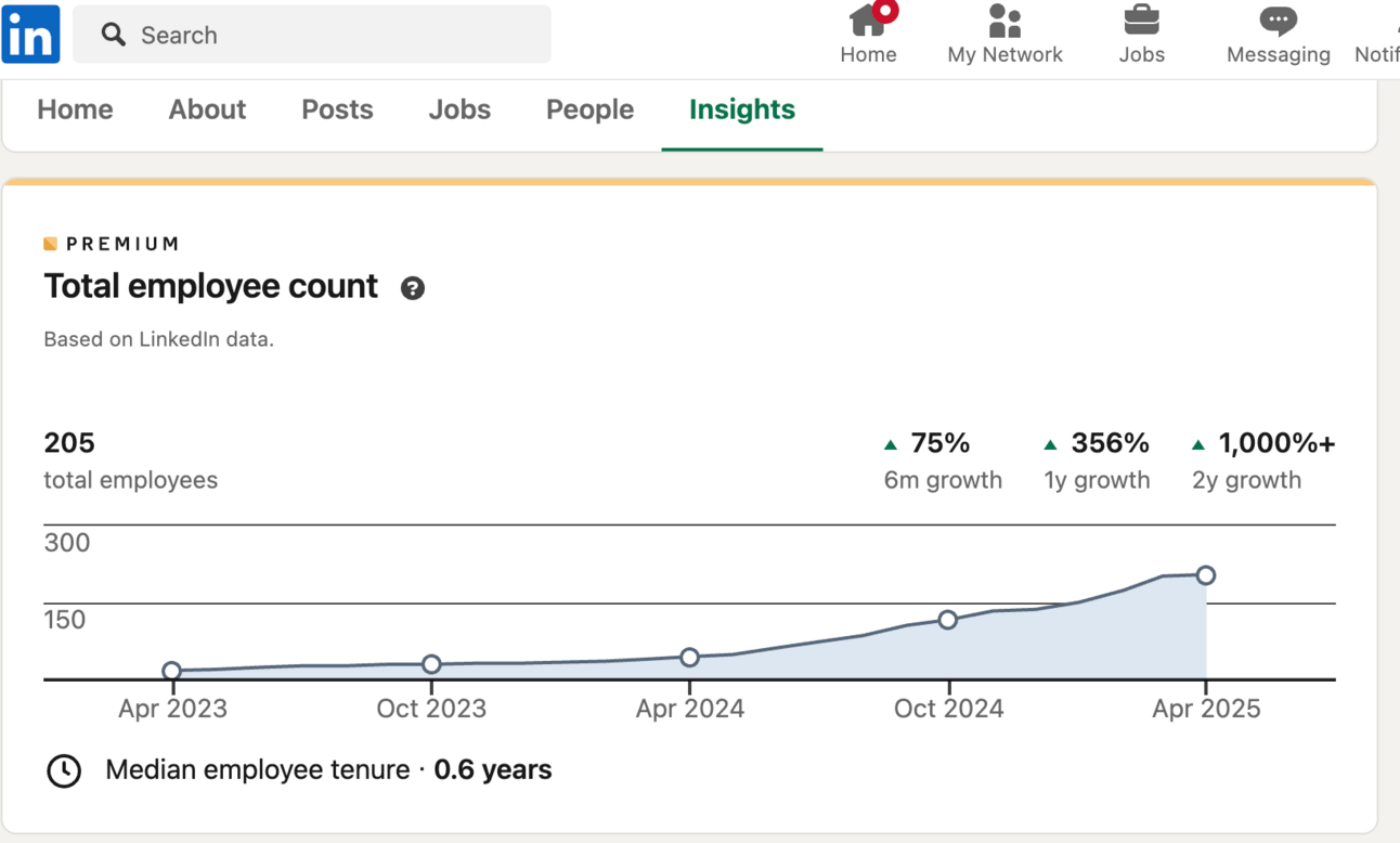 Example of healthy company headcount growth under “Insights” tab of a company page.
