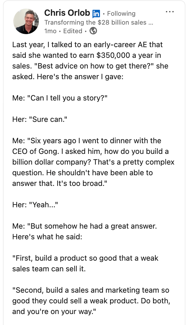 Chris Orlob, an early hire at Gong, had a post that summed up this point with a good story: