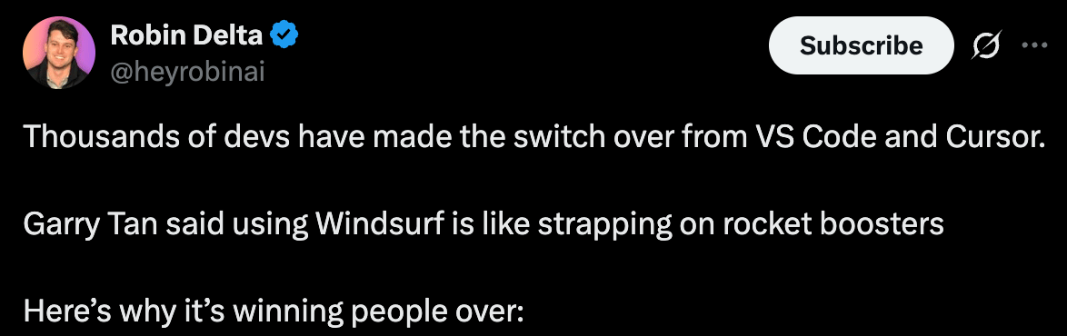 Reddit threads & X posts where more and more engineers were praising Windsurf’s performance