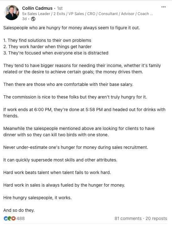 There is a split view on this in the sales community: Should we hire coin-operated reps or not? For example, AJ’s take is the polar opposite of the top-down, old-school sellers, like the ones you see at Oracle, Salesforce, Outreach, Gong, or selling a commodity (staffing, HR software, etc.). See this take from Collin Cadmus below: