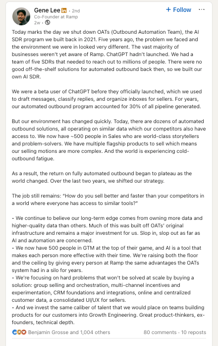 Gene Lee, co-founder of Ramp, announced that Ramp is shutting down its OAT (Outbound Automation Team).